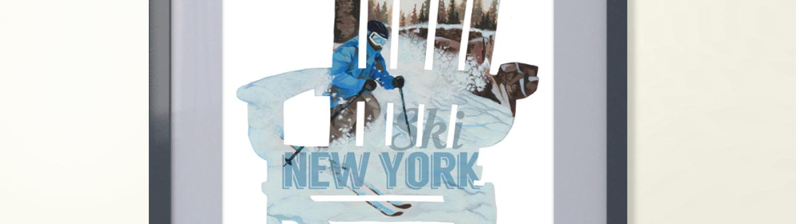 The Ski New York poster is an artistic tribute to skiing in the great state of New York, home of the most ski areas in the United States. Designed and illustrated by New York State artist and skier Tom Moyer. Tom is also the owner of Downhill Threads – an original ski clothing brand from Rochester, N.Y.