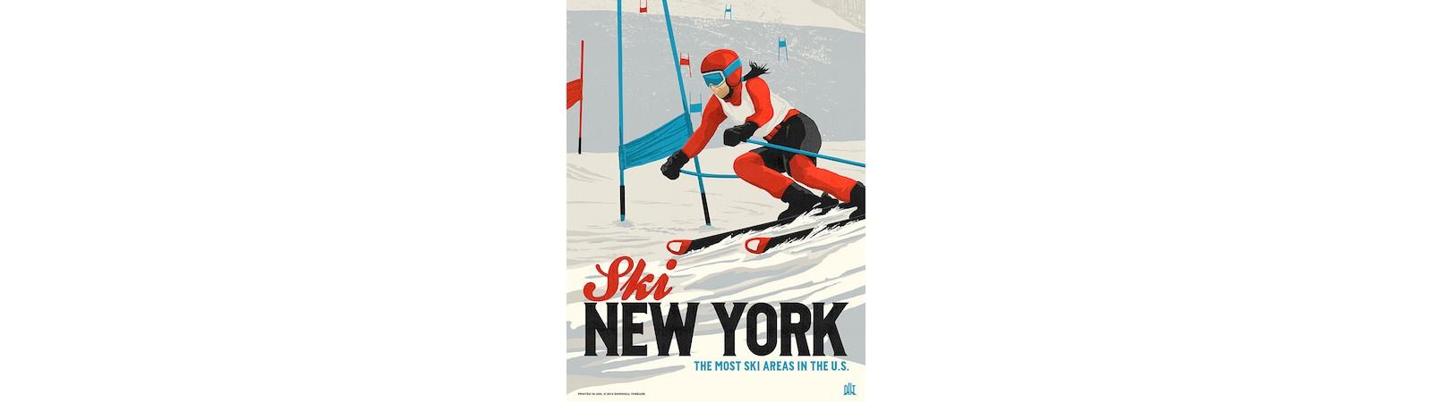 The Ski New York poster is an artistic tribute to skiing in the great state of New York, home of the most ski areas in the United States. Designed and illustrated by New York State artist and skier Tom Moyer. Tom is also the owner of Downhill Threads – an original ski clothing brand from Rochester, N.Y.
